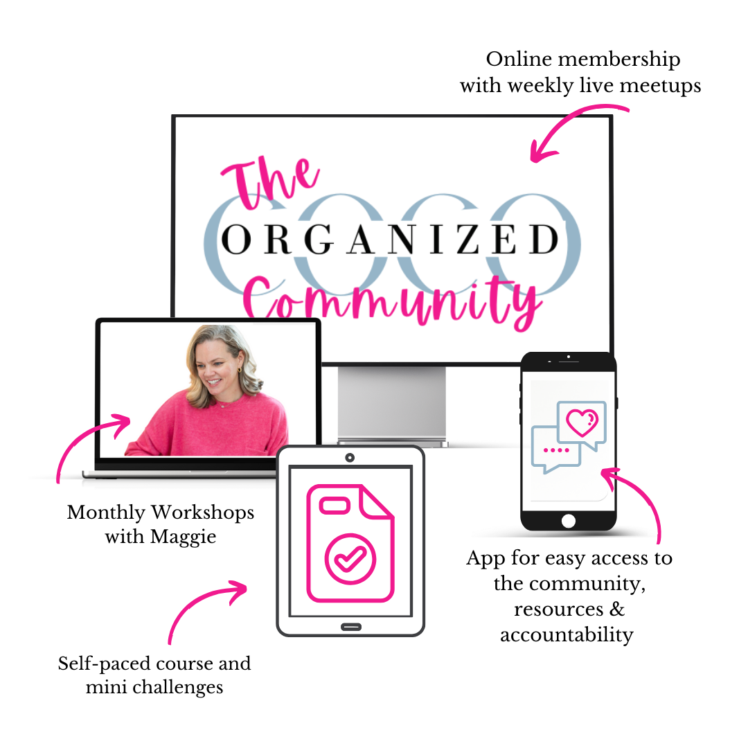 Weekly live guided decluttering + virtual organizing sessions for accountability and follow-through, monthly workshops for a plan, and community + professional support to help you make room for what matters most.